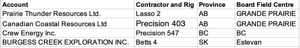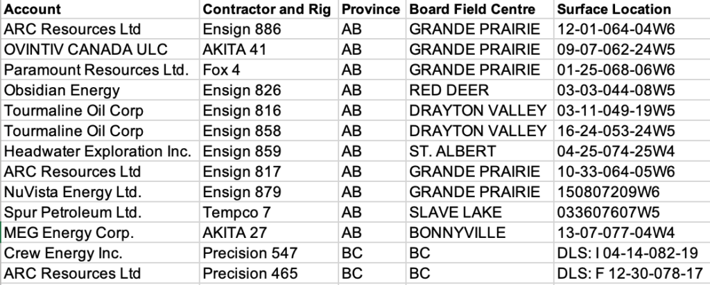The table below is a summary of the drilling rigs that spud wells in Western Canada last week for the first time since spring break-up 2021.