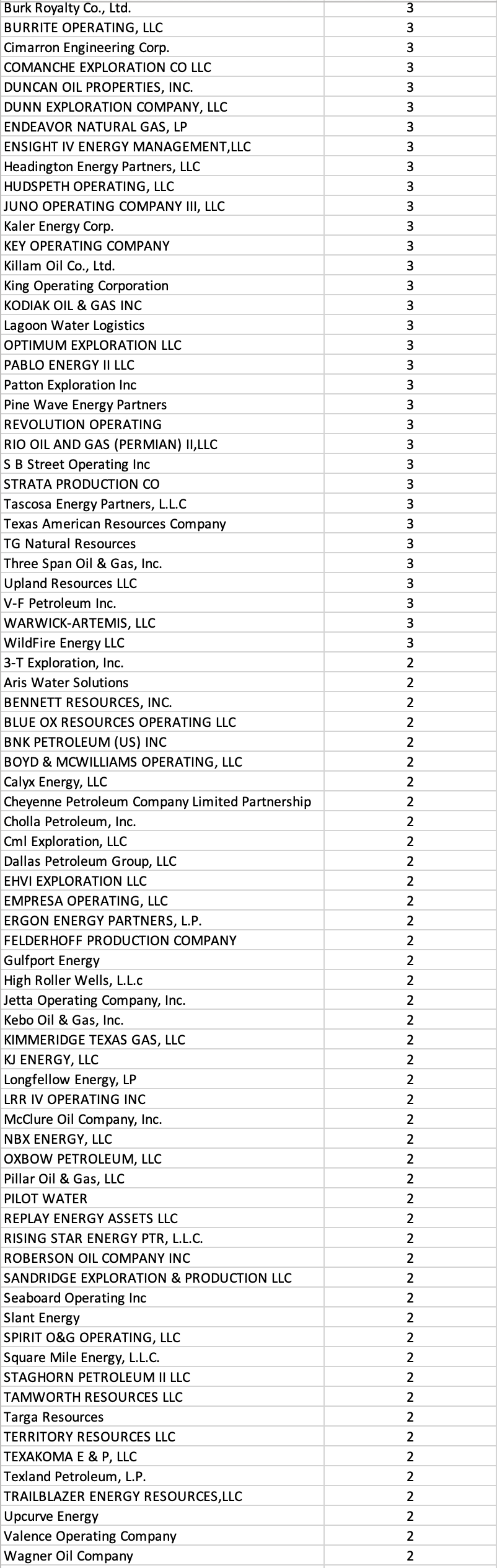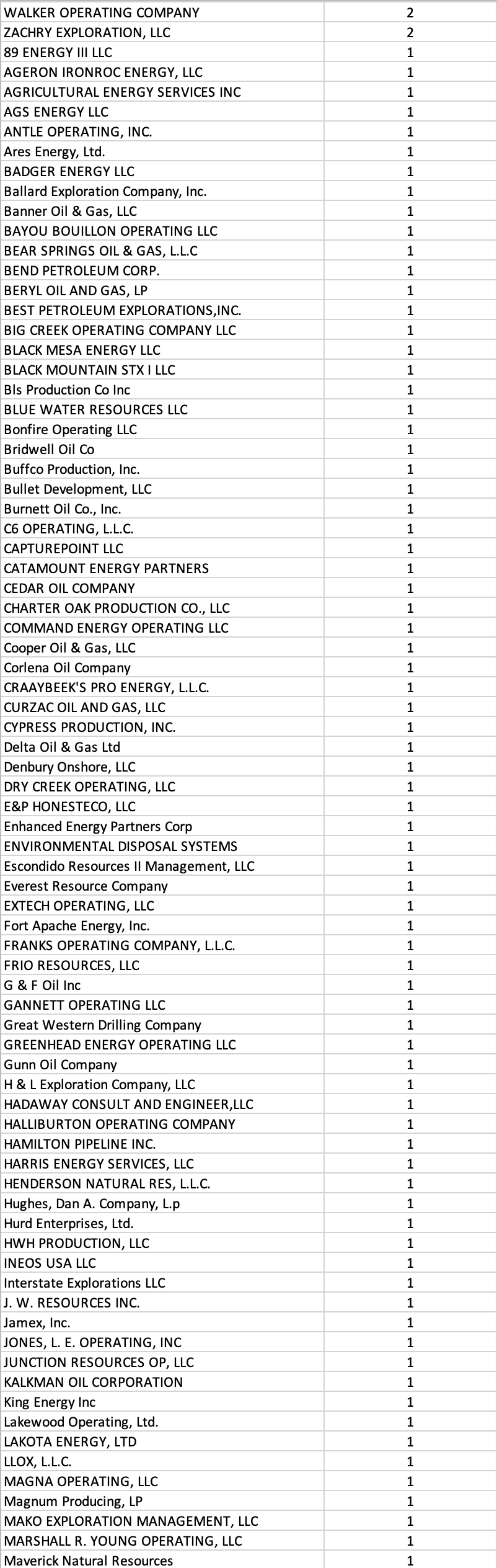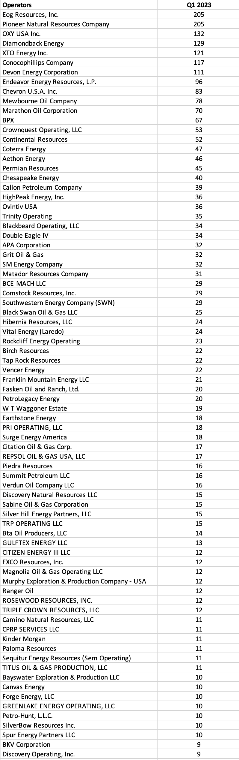 In Q1, 2023 3600 wells were drilled in Texas (2600), Oklahoma (300), New Mexico (00) and Louisiana (200). The Top Operators by well drilled in Q1, 2023 include;