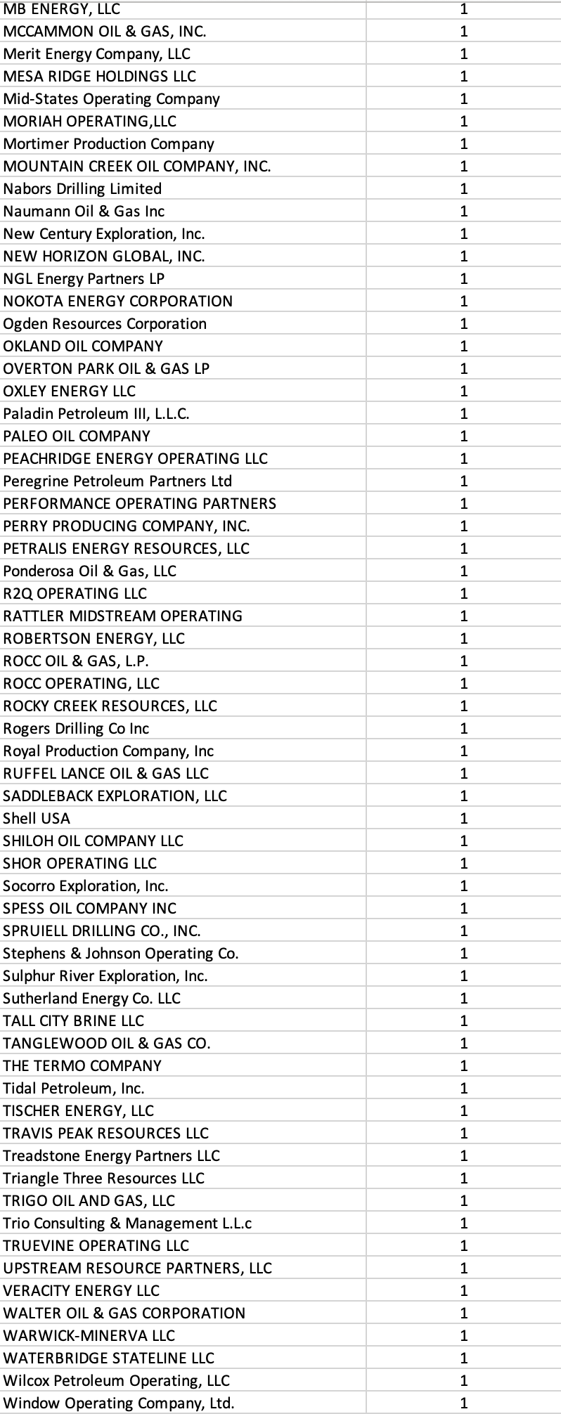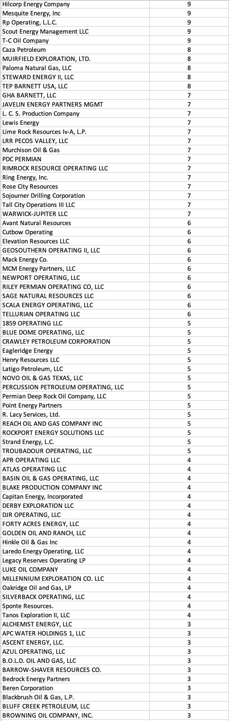 Oxy – 132 wells drilled Q1, 2023. Oxy USA Inc. ranks #6 in wells drilled in 2022 with 288 wells drilled.