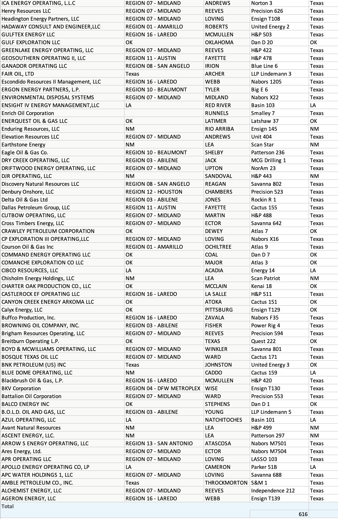 - Top Oil & Gas Operators by rig count Include; Pioneer Natural Resources Company (24 rigs), Eog Resources, Inc. (28 rigs), Devon Energy Corporation (18 rigs), Mewbourne Oil Company (20 rigs), Conocophillips Company (12 rigs), Oxy (21), Endeavor Energy (14), XTO (18), AETHON ENERGY (12)